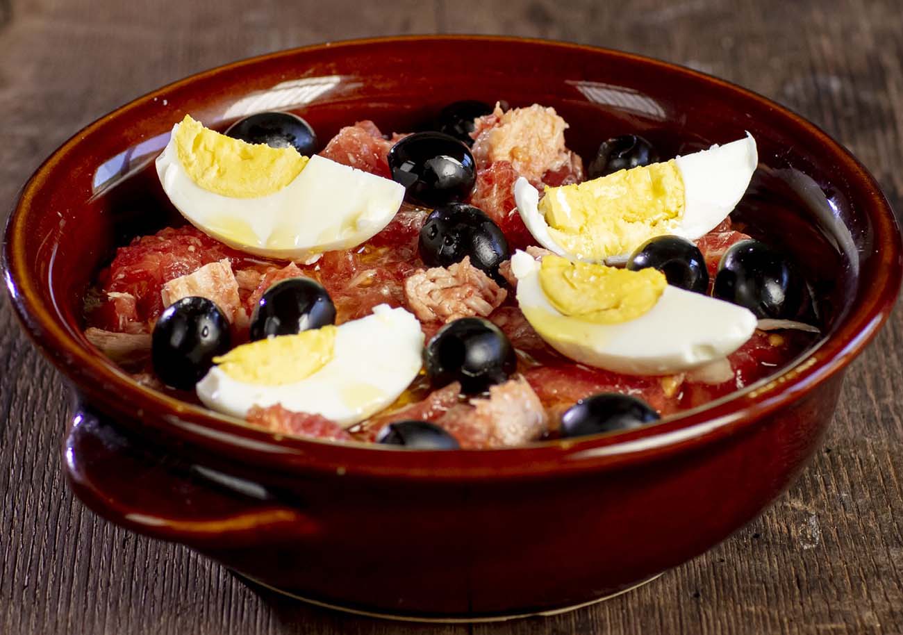Este plato frío me sorprendió por su sencillez y sabor: tomate en conserva, cebolla, aceitunas negras, atún y huevo duro. El secreto está en el aceite de oliva virgen extra de excelente calidad que lo cubre todo.